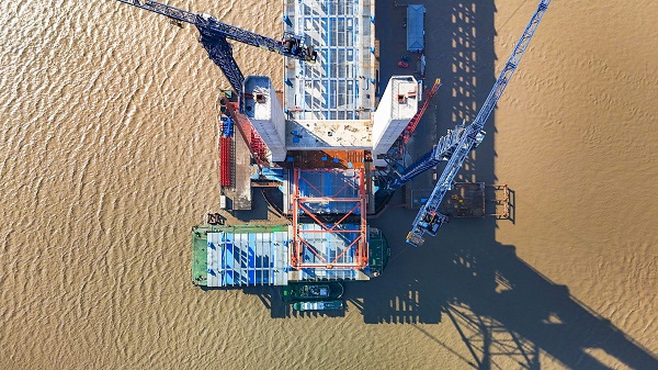 11月20日,随着大桥北岸(启东侧)最后一段边跨钢梁精准落位,历时158天、吊装跨度达1205.4米的崇启跨江公铁大桥非通航孔水上吊装作业圆满完成。至此,项目整体施工进度达80%。这,标志着国家“八纵八横”高速铁路网沿江高铁通道的控制性工程向正式建成又迈进了一大步。