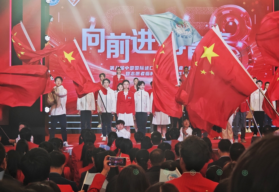 连续第三年服务进博,上海交通大学生物医学工程大四男生顾奕秋今天获得了特别荣光——作为上岗仪式旗手,顾奕秋接过旗帜,带领伙伴们喊出熟悉的誓言,“向前进,博青春!为进博,一起来!”