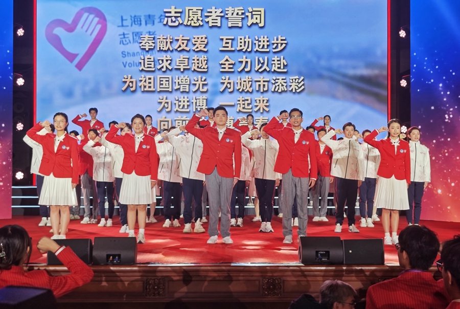 图第八届中国国际进口博览会志愿者上岗宣誓仪式现场,志愿者宣誓上岗 摄影:陶磊
