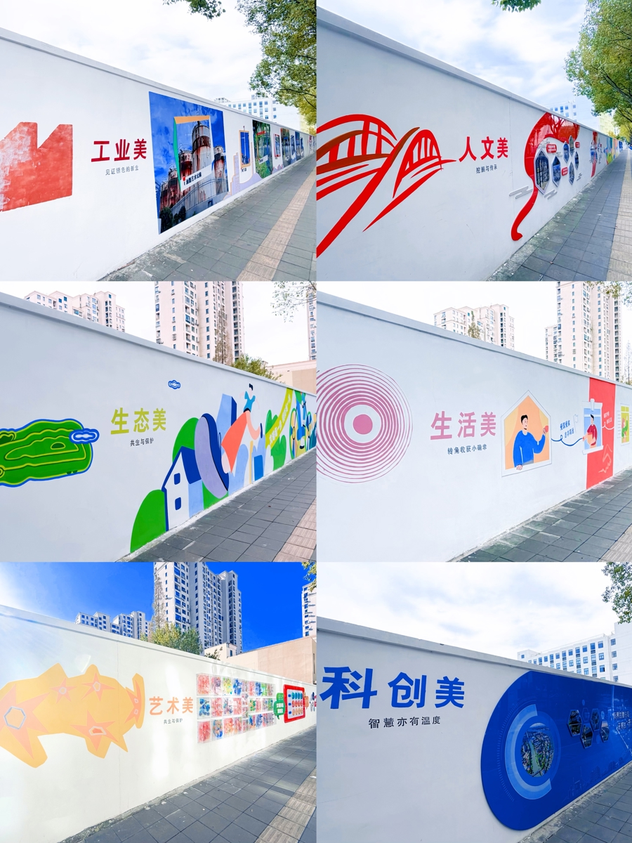 在学生们的画笔下,顺平路街区有“六美”。“工业美”板块将百年工业元素巧妙融入画面,诉说岁月变迁与时代新生;“人文美”板块呈现一系列社区活动,生动展示激活自治活力;“生态美”板块展示废弃塑料瓶再生作品,传递绿色生活风尚;“生活美”板块紧扣15分钟生活圈建设,发现生活中的小确幸;“艺术美”板块让墙面成为流动的艺术展厅;“科创美”板块则展现科技赋能下的城市新风貌。