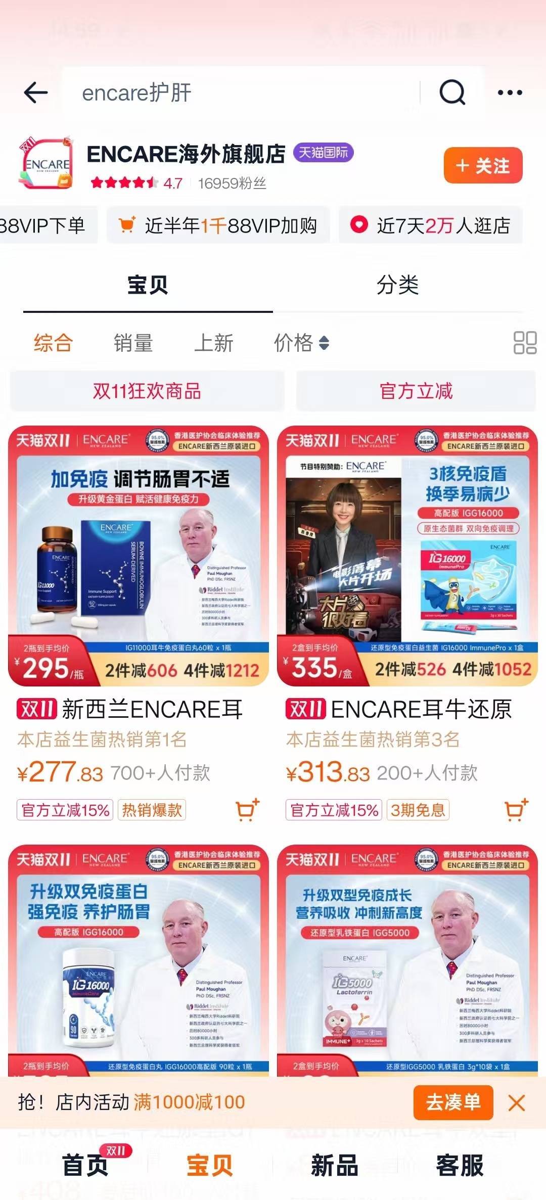 其晒出的图片显示,一家名为“ENCARE海外旗舰店”的店铺,该店铺标识中含“天猫国际”字样。其售卖的产品中,有一款名为“新西兰ENCARE耳牛免疫球蛋白”的商品,其首页放置了梁朝伟的半身照片,配有“节目特别赞助”“大片很好看”等字样。